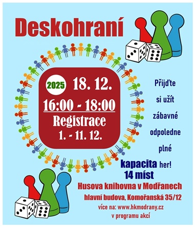 Akce je určena pro registrované čtenáře knihovny a jejich rodinné příslušníky. Kapacita je omezena na 14 osob, proto je nutné se předem registrovat. Registrace probíhá od 1. 12. do 11. 12. přihlásit se můžete emailem na info@hkmodrany.cz