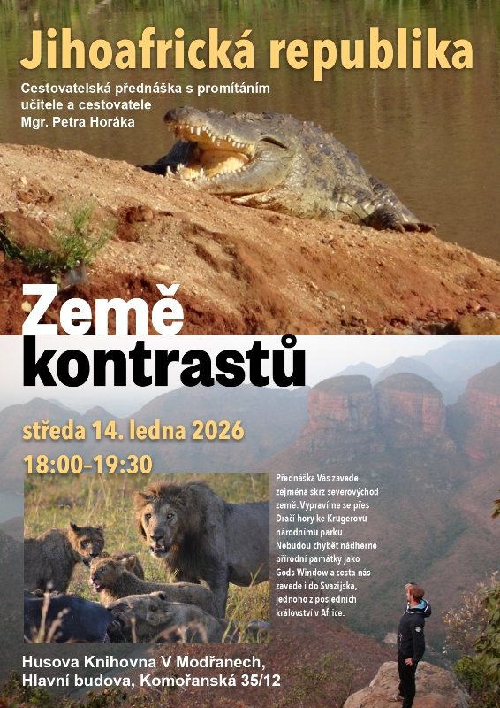 14. 1. 18:00 – 19:30 Cestovatelská přednáška s promítáním - Jihoafrická republika - Země kontrastů. Mgr. Petr Horák, učitel a cestovatel.
